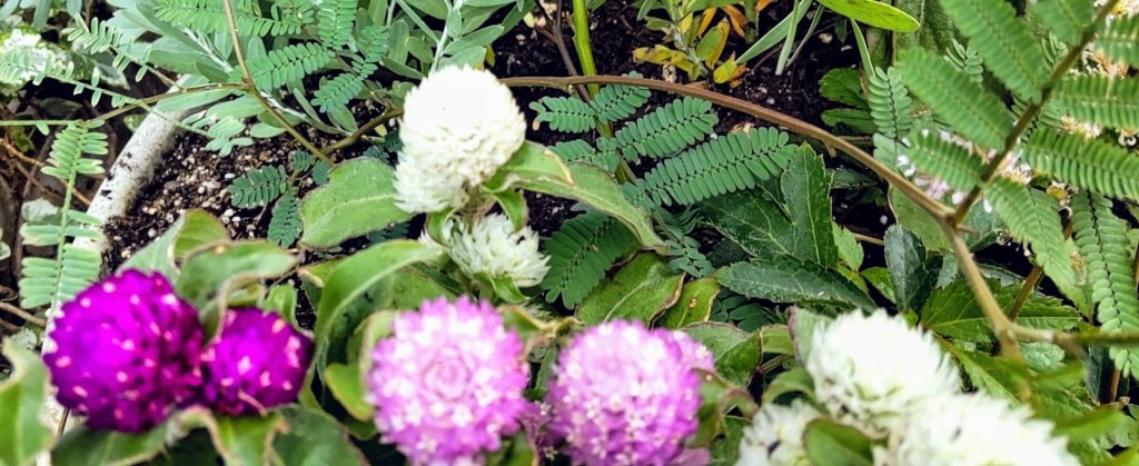 バイト先の近くの、寄植えの中に咲いていた、3色の千日紅(せんにちこう)☆
