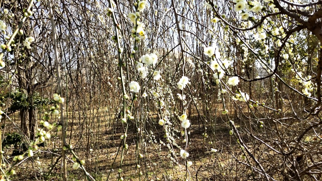 植木屋さんの畑の一画にて、 白い、しだれ梅を発見〜🎵