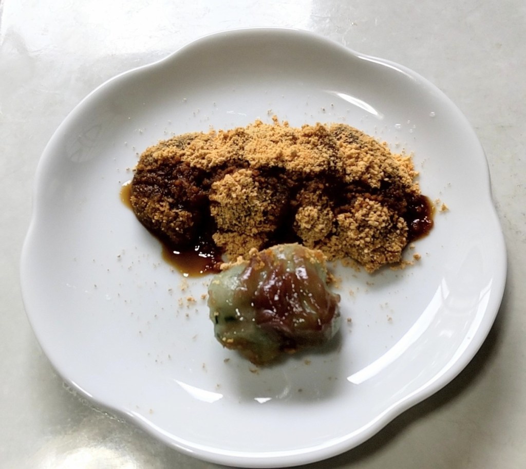 おやつの時に、美味しいよもぎだんご(手前)と、 わらび餅を頂きました!