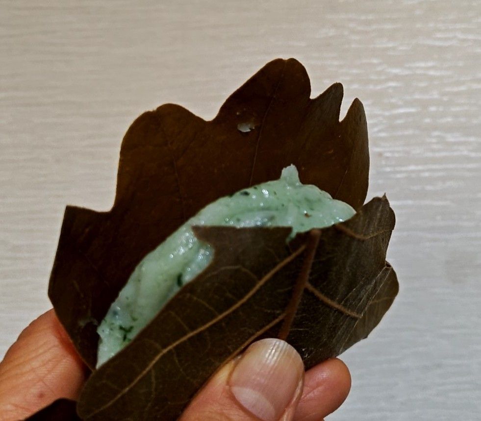 よもぎ味のかしわ餅を、おやつ用に買って来て、頂きました!