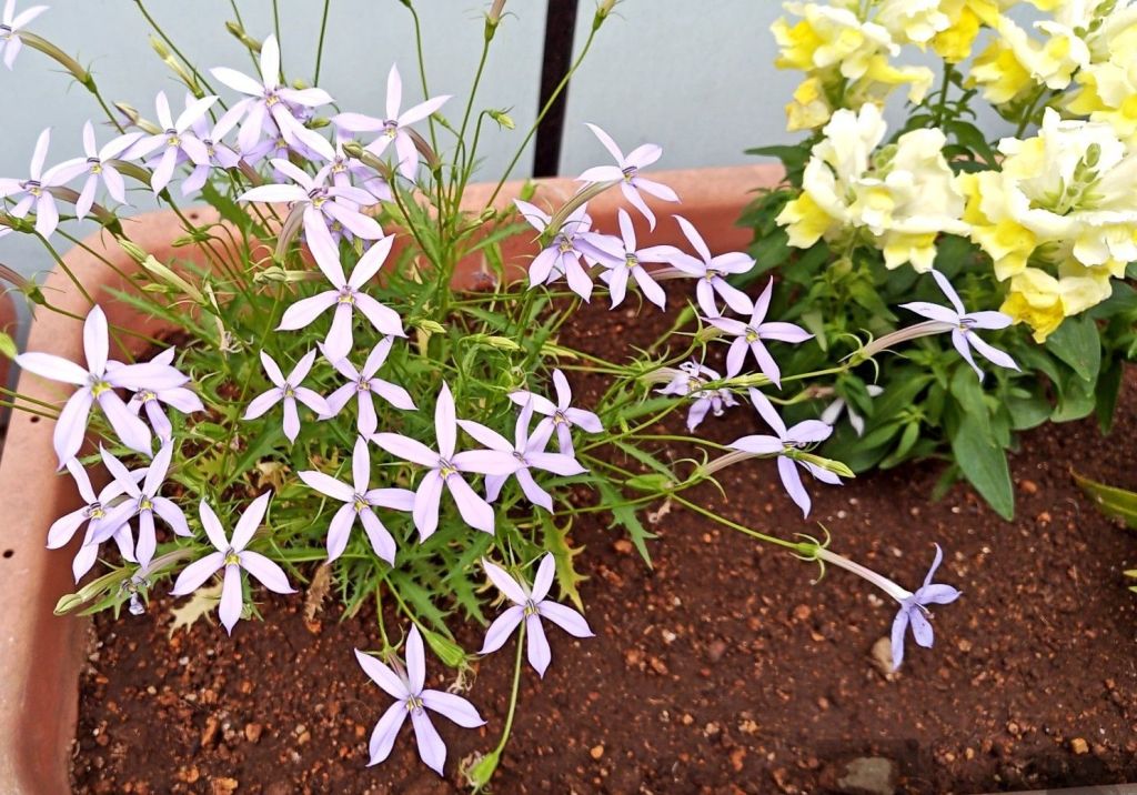 後ろのライトイエローのお花(キンギョソウかな?!)との 色の対比が、