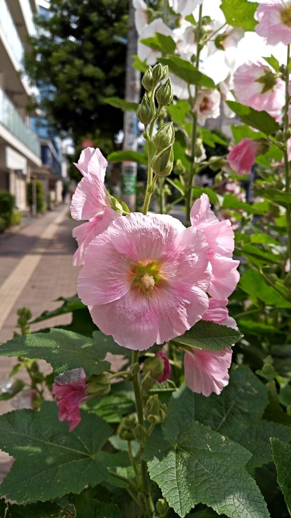 道路脇の花壇に、ピンク色の立葵(たちあおい)が、沢山咲いていました!
