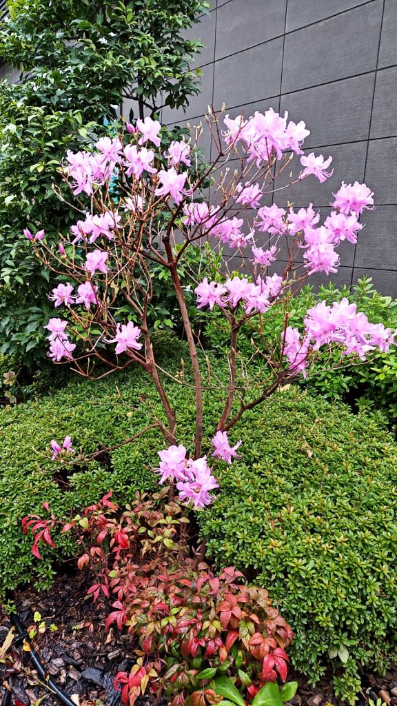 ある銀行の外の花壇に、かわいい、ピンク色の、みつばつつじが、咲いていました!