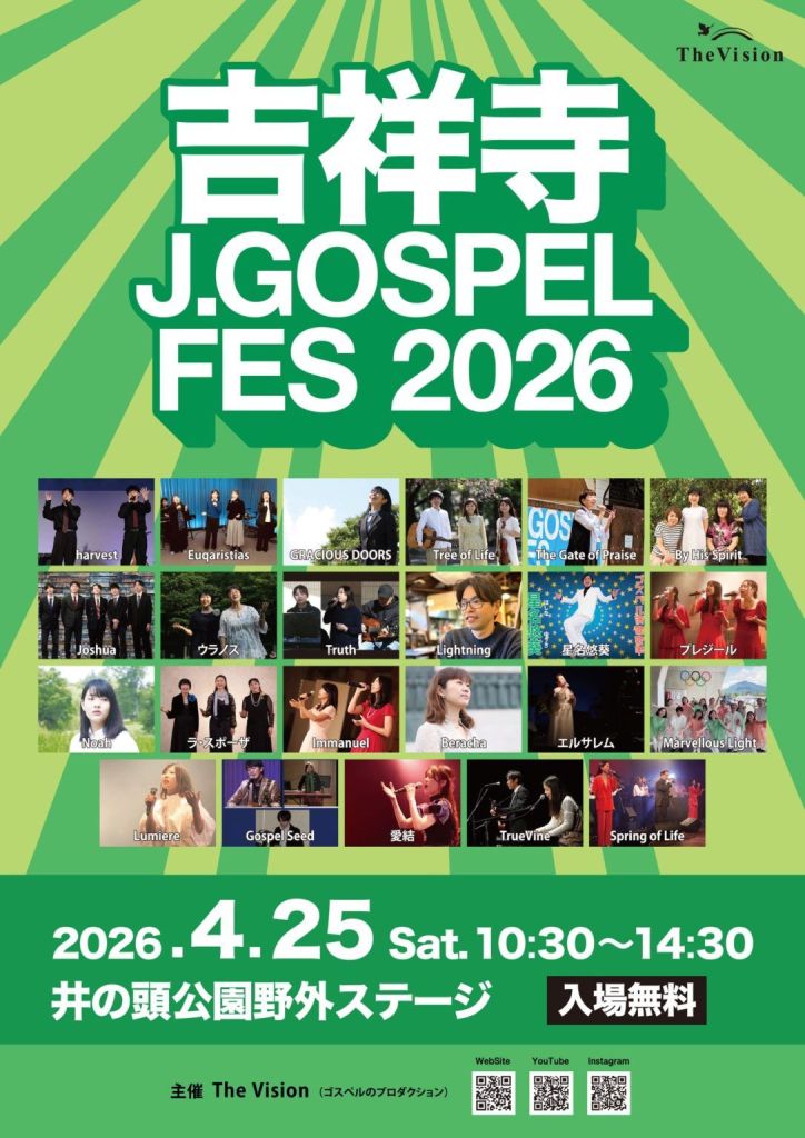 本日2026年4月25日(土)、井の頭公園野外ステージにて「吉祥寺J.GOSPEL FES 2026」が開催されます。時間は10時30分から14時30分まで、入場無料で行われます。