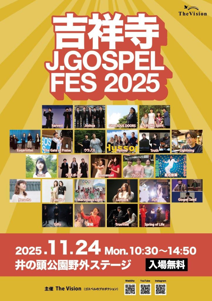 本日2025年11月24日(祝)10:30~14:50まで、井の頭公園野外ステージにて吉祥寺 J.GOSPEL FESが行われます。入場無料です。是非お立ち寄り下さい。